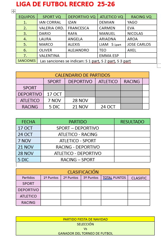 En este primer trimestre tenemos un campeonato de futbol sala (durante los recreos de los viernes), y el torneo de ajedrez (en los recreos de los miércoles).