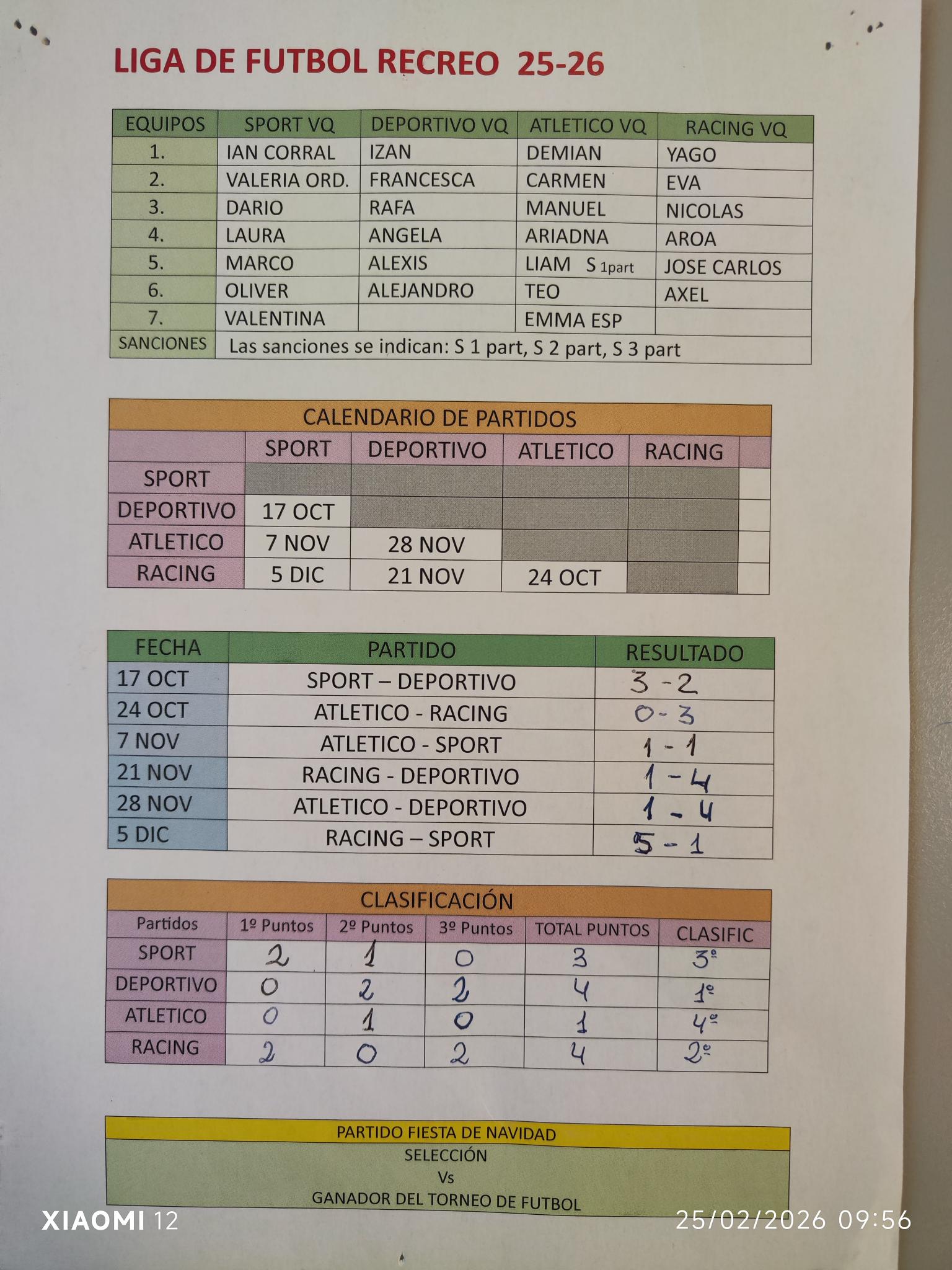 En este primer trimestre tenemos un campeonato de futbol sala (durante los recreos de los viernes), y el torneo de ajedrez (en los recreos de los miércoles).